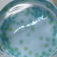 The experiment allows verifying that calcium alginates behave both as a solid and a liquid. A few drops of pH indicator are included into alginates droplets, that are then bring to a different pH value. This process can be followed by eye thanks to this color modification.
